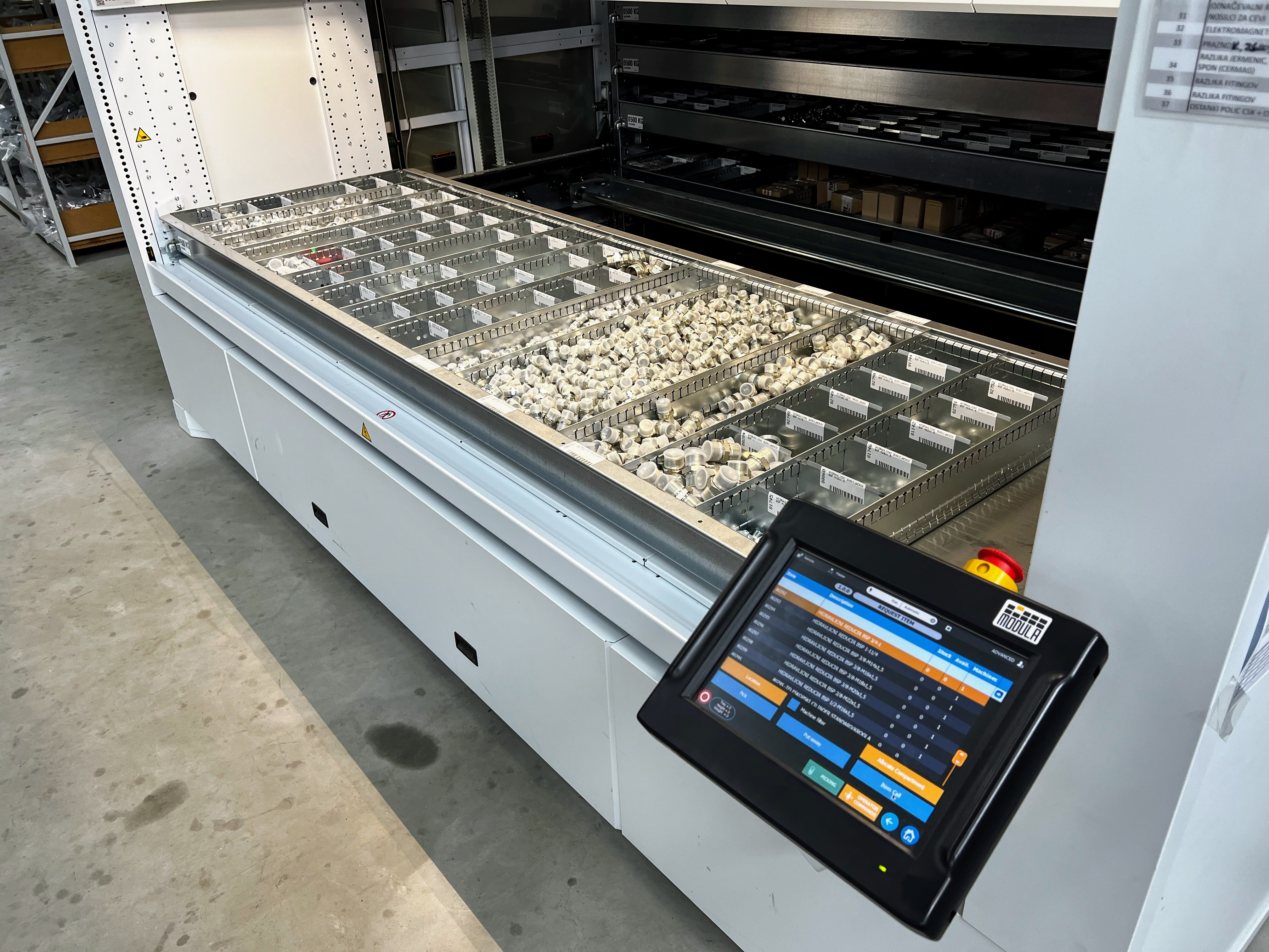 Smulkioms detalėms naudojame „išmanųjį sandėlį“ (Modula). Prekės pagal kodus sudėtos į stalčius su daug skyrių. Įvedus kodą ekrane, sistema per kelias sekundes atneša reikiamą stalčių ir pažymi skyrių lazeriu. Sistema integruota su atsargų apskaita, todėl likučiai visada tikslūs. Tai ypač svarbu jungtims, nes kiekvieną dieną montuojame daugybę individualiai užsakytų hidraulinių žarnų su skirtingais antgaliais.