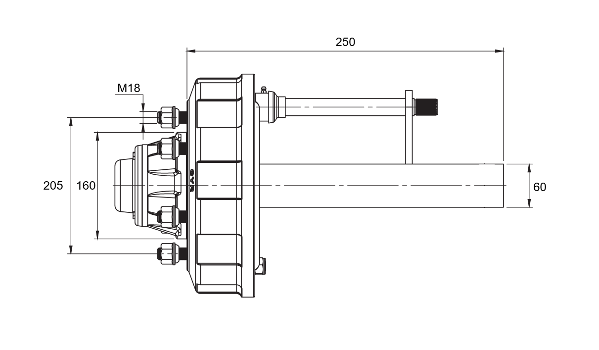 Stubinė ašis skirta įvairių tipų priekaboms su stabdžių sistema. Stubinės ašies ilgis yra 250 mm, o krovinio apkrova siekia iki 2700 kg.
